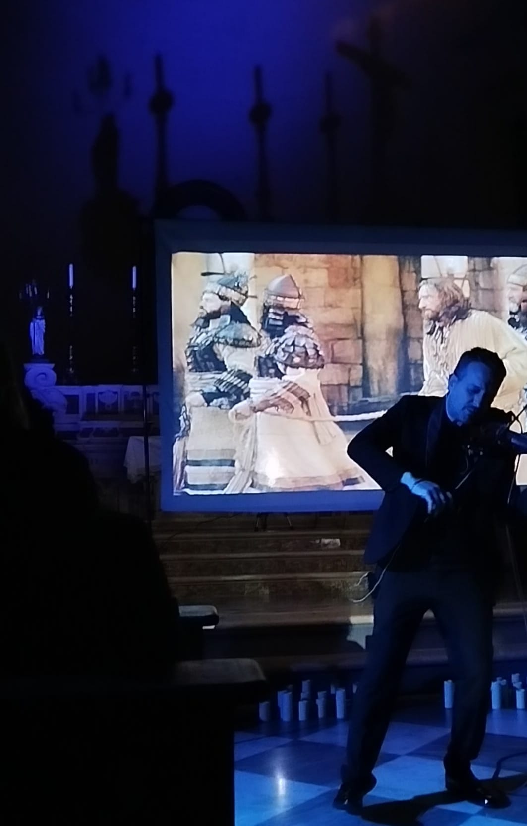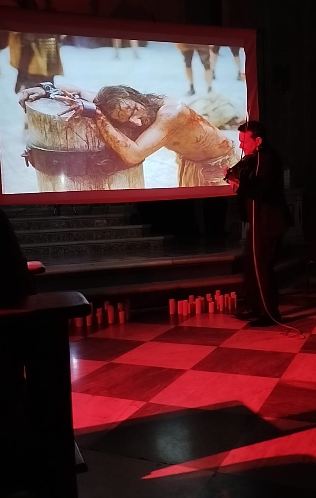 Silenzio. L’interno della chiesa è buio. Ad illuminare i volti degli spettatori solo uno schermo gigante sul quale scorrono le immagini del Cristo nei momenti salienti della sua Passione.
